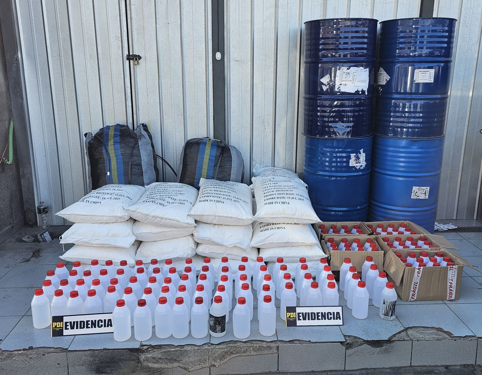 En el marco de las diligencias, los detectives en conjunto con el Ministerio Público, intervinieron un domicilio en la ciudad de Arica, donde se incautó más de 400 Litros de Acetona y cerca de 500 kilos de cloruro de sodio, elementos que se utilizan para la elaboración de droga.
