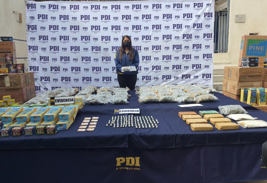 Oficiales policiales de dicha unidad especializada, realizaron diversas diligencias en el sector “El Boro” de la comuna de Alto Hospicio, estableciendo que uno de los imputados recibiría una cantidad determinada de drogas de parte de su proveedor de nacionalidad boliviana, donde posterior a su transacción, se incautó lo siguiente: 62 paquetes contenedores de cannabis sativa; 33 kilos con 518 gramos; camión marca Mitsubishi; ocho paquetes de cocaína base, peso bruto 8 kilos y 134.39 gramos; dos paquetes ketamina, peso bruto 2 kilos, 227.06 gramos; 94 ovoides de clorhidrato de cocaína, peso 1 kilo con 241.46 gramos y $1.000.000 en dinero en efectivo. Asimismo, en el trabajo investigativo, se le incautó 56 pacas de cigarrillos de contrabando y diversas cajas con fuegos de artificio.