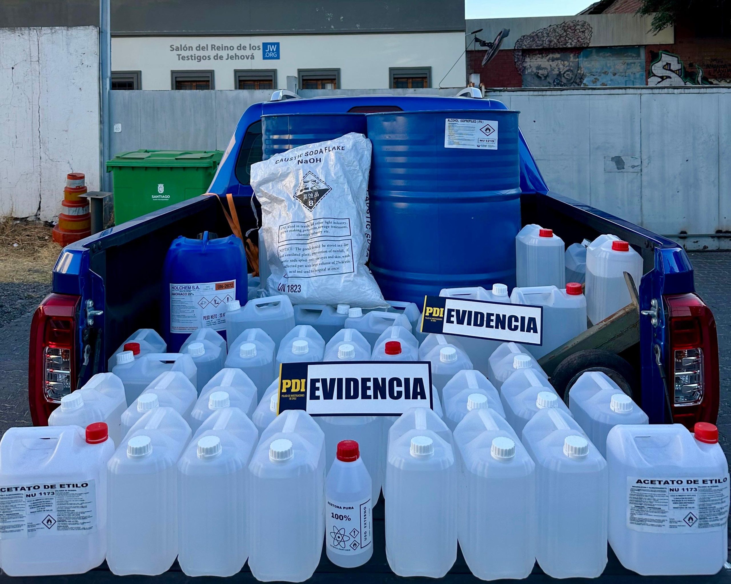 En total, se incautaron 200 litros de acetona líquida, y un poco más en otros formatos, además de alcohol isopropílico, metanol, acetato de etilio, soda cáustica y amoníaco, todos precursores químicos para la fabricación de drogas.