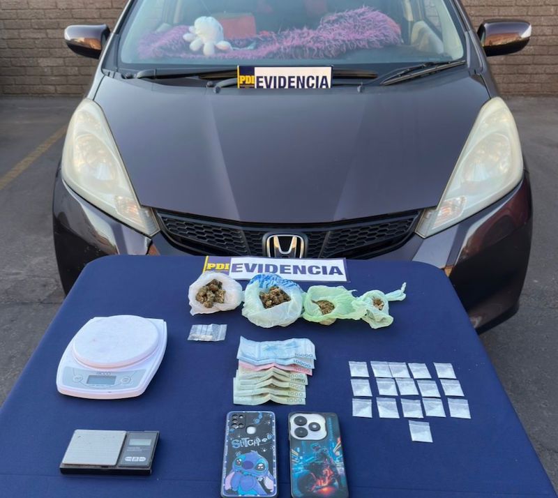 “En la revisión de dicho móvil fue hallada una sustancia vegetal, que a la prueba de campo respectiva arrojó coloración positiva para THC, planta de cannabis tardío en proceso de secado, además de dieciséis envoltorios con una sustancia en polvo de color azul que la prueba de campo arrojó coloración positiva para ketamina”, explicó el subprefecto Juan Huenchumán, jefe de la Bicrim de la PDI Arica.