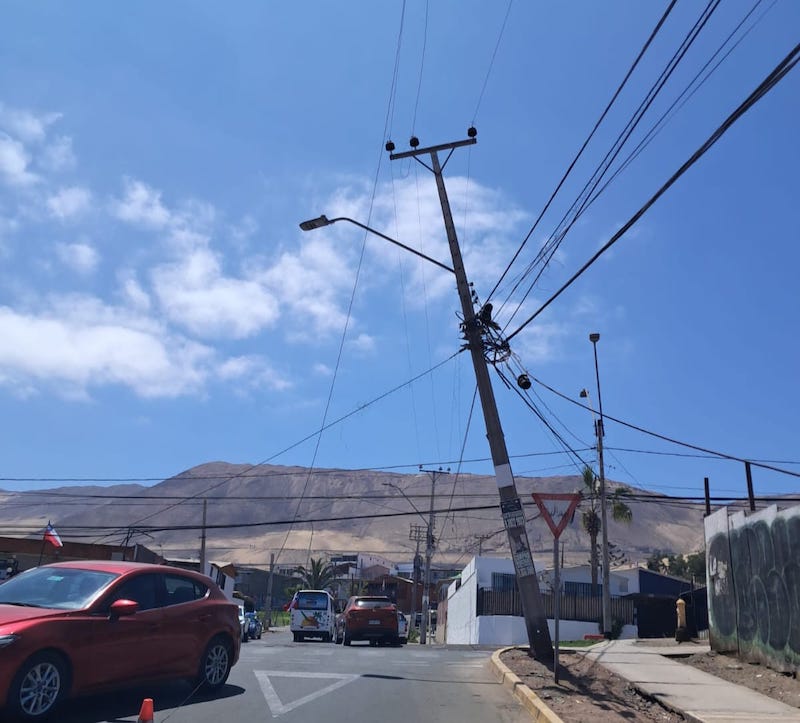 CGE informó que se registró una interrupción del suministro eléctrico que afecta a 1.152 clientes de perímetro ubicado de calle Salvador Allende, Río Seco, La Tirana y Presidente Frei, derivada de un accidente de tránsito donde un vehículo colisionó y dañó un poste de la red de media tensión.