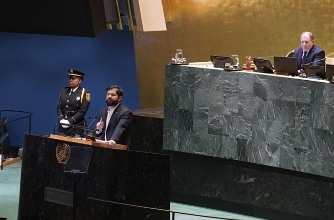 Ante esta asamblea, Chile reafirma su compromiso con la democracia siempre como el único sistema capaz de mantener la paz, alcanzar el desarrollo sostenible y proteger la dignidad, los derechos y las libertades fundamentales de las personas.