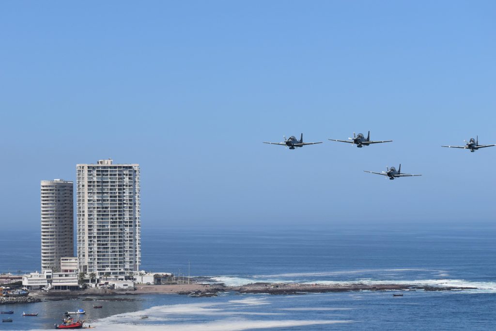 La conmemoración del nuevo aniversario de la FACH continúo con el desfile por parte de la Unidad de Formación compuesta por representantes de la Institución, además de delegaciones de Ejército, Armada y Carabineros de Chile. Y desde los cielos nortinos una bandada de aviones A-29 Super Tucano sobrevolaron el concurrido desfile para celebrar junto a la comunidad los 95 años de vida de la Fuerza Aérea de Chile.