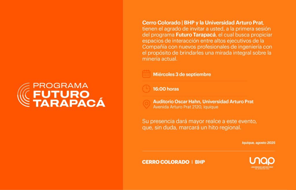 Hoy, a las 16 horas, en el auditorio «Oscar Hahn» de la UNAP, es la primera sesión del proyecto “Futuro Tarapacá”, instancia impulsada por Cerro Colorado | BHP y la Universidad Arturo Prat, que busca generar un espacio de encuentro entre altos ejecutivos de la compañía, estudiantes y egresados de Ingeniería de la Casa de Estudios Superiores, con el propósito de brindar una mirada integral y actual de la Minería.