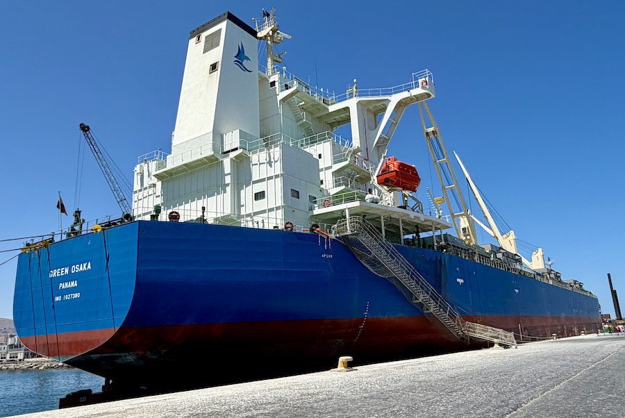 Las faenas se efectuaron en el buque Green Osaka, proveniente del puerto de Qingdao, China. La nave —de reciente construcción (2025) y bajo bandera de Panamá— cuenta con una eslora de 210 metros y una manga de 36 metros. Las operaciones se extendieron por un total de 11 turnos, contribuyendo directamente a la generación de empleo para trabajadores portuarios.