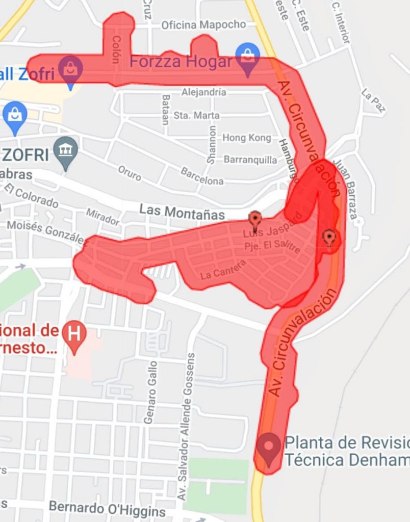 El asunto es que el lugar nuevamente fue la avenida Circunvalación. Por lo que un sector de la población «Jorge Inostrosa» tuvo una interrupción en el suministro de energía eléctrica en el sector que muestra el siguiente plano: