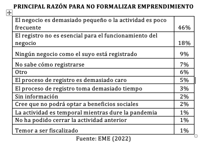 “Baja conciencia de la red de apoyo al desarrollo y formalización de los emprendimientos, junto con la ausencia de un marco y estrategia integral de apoyo, alineando los incentivos presentes en el ecosistema” es el último factor planteado por las personas para mantener sus negocios en la informalidad.