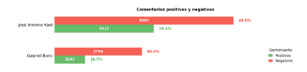 Uno de los principales hallazgos del estudio es la marcada diferencia en el volumen de comentarios asociados a las principales figuras políticas. Durante el período analizado, José Antonio Kast concentró 9.341 comentarios, mientras que Gabriel Boric registró 3.106, lo que implica que el primero generó aproximadamente tres veces más conversación que el mandatario saliente en las noticias analizadas.