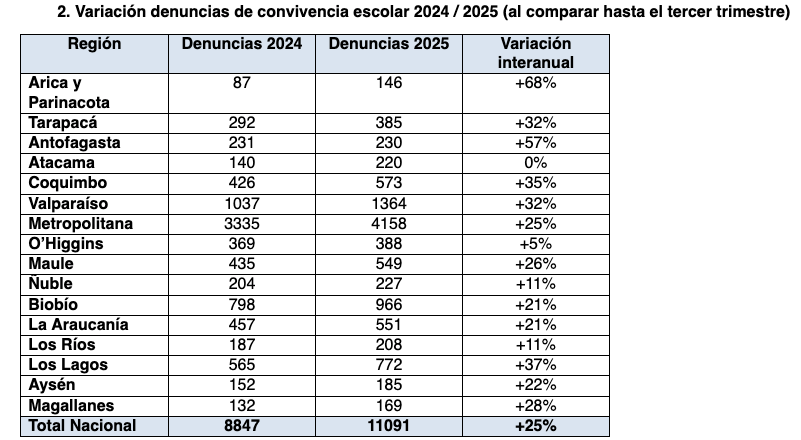 • Un informe elaborado por el Observatorio de Ciudadanía, Convivencia y Bienestar Educativo (OCCBE) de Universidad de La Frontera, reveló que los reportes por situaciones vividas dentro de los establecimientos llegaron a 11.091 casos entre enero y septiembre de 2025, con un aumento de 25% a nivel global. Esto indica que la violencia relacional sigue manifestándose como una práctica arraigada en la cultura escolar.