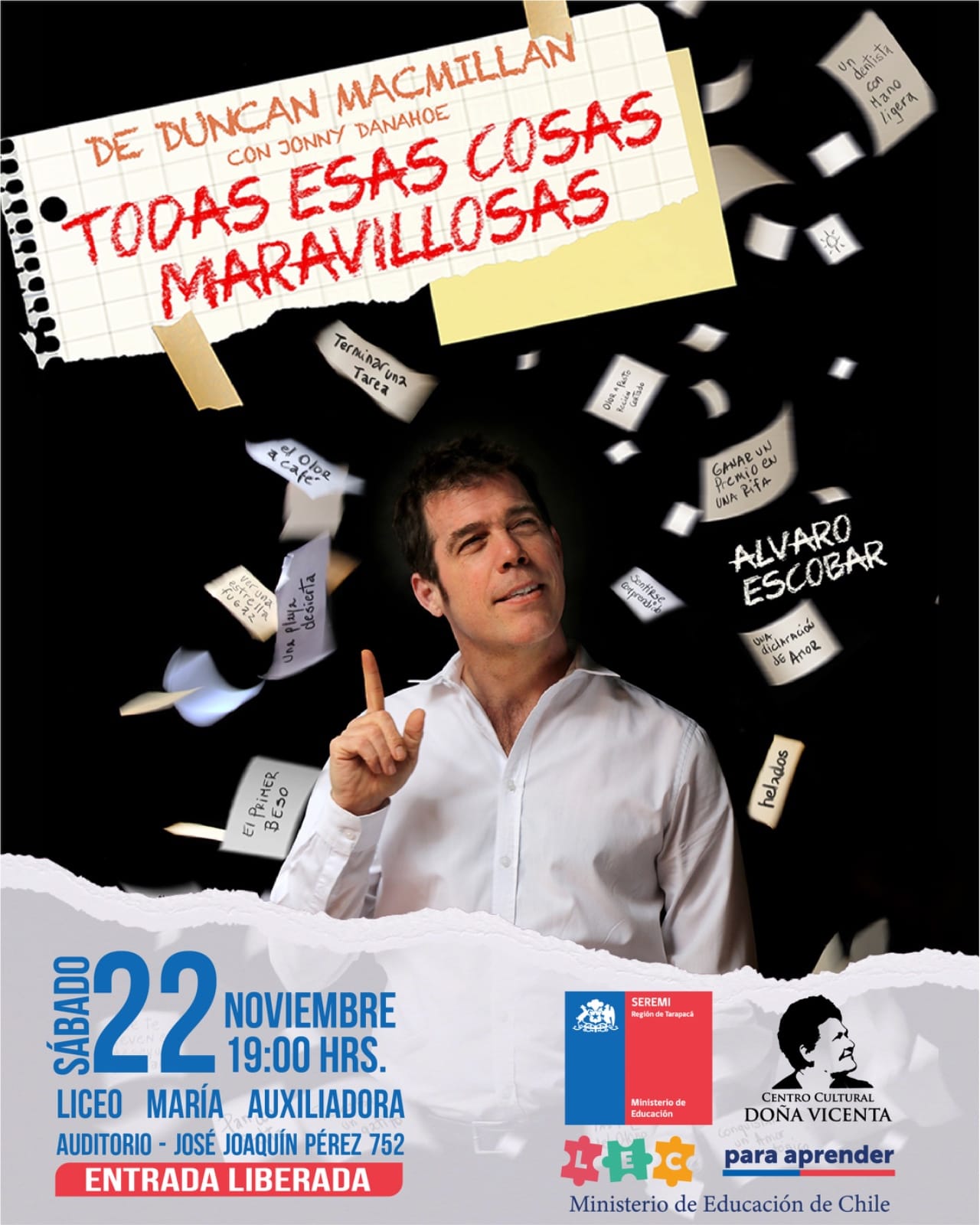 La Seremi de Educación Carolina Vargas Bruna invitó a las familias y comunidades educativas de la región de Tarapacá a presenciar la obra de teatro «Todas esas cosas maravillosas» que el actor Álvaro Escobar pondrá en escena este sábado 22 de noviembre, a las 19 horas, en el auditorio del Liceo María Auxiliadora de Iquique, ubicado en la intersección de las calles José Joaquín Pérez con Barros Arana, comuna de Iquique.