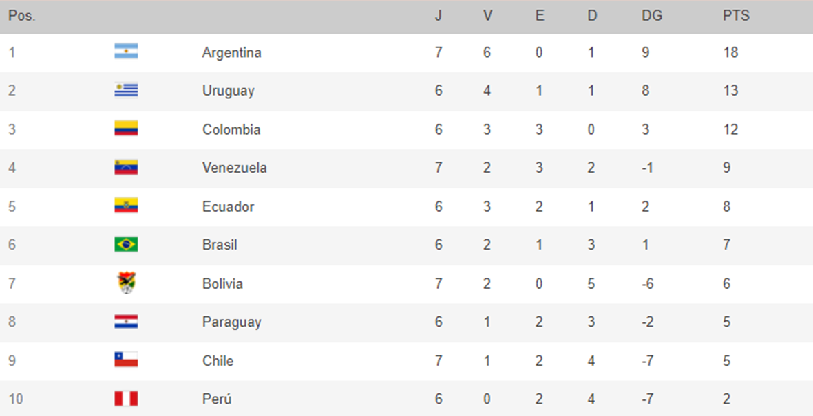 CLASIFICATORIAS TABLA DE POSICIONES SUDAMÉRICA