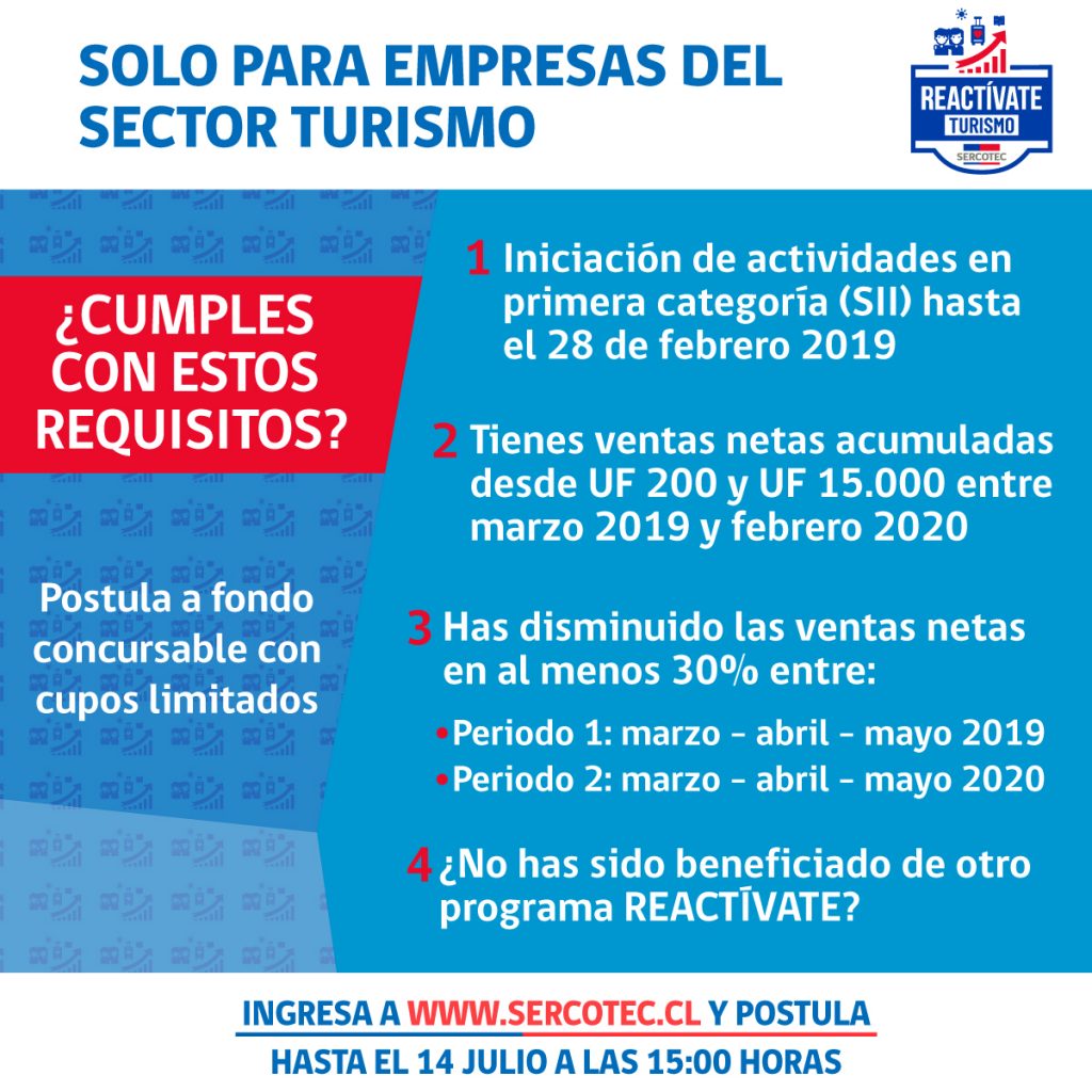 Ser empresa, persona natural y/o jurídica, pertenecientes al rubro turístico, con iniciación de actividades en primera categoría, hasta el 28 de febrero de 2019 y estar vigente al inicio de la convocatoria. Además, las empresas deberán contar con un total de ventas netas acumuladas desde UF 200, hasta UF 15.000, en el periodo comprendido entre marzo de 2019 a febrero 2020.