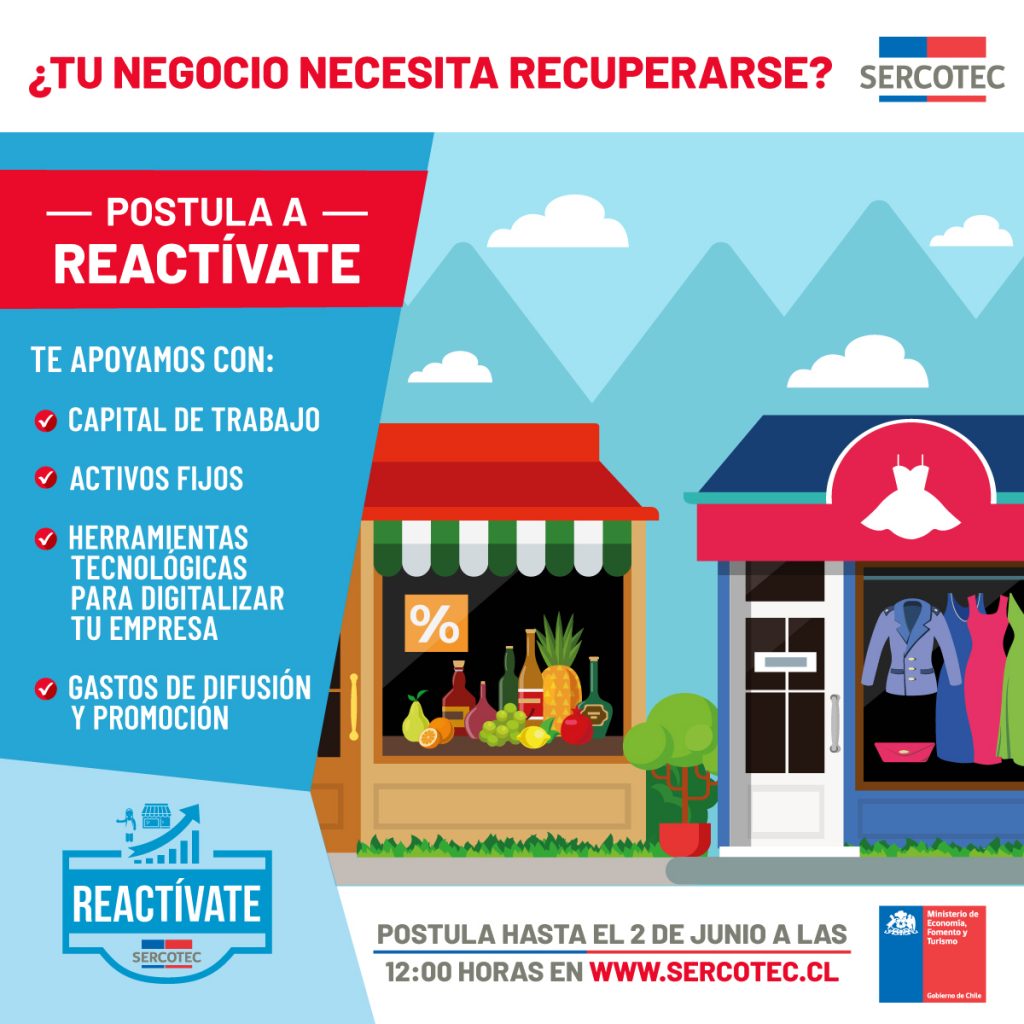Sercotec, organismo dependiente del Ministerio de Economía, Fomento y Turismo dio inicio este martes a la convocatoria del programa Reactívate, que entrega un subsidio de hasta $3.000.000 a las mipes, para apoyarlas con capital de trabajo, brindándoles así liquidez para sortear los efectos económicos de la emergencia sanitaria actual.