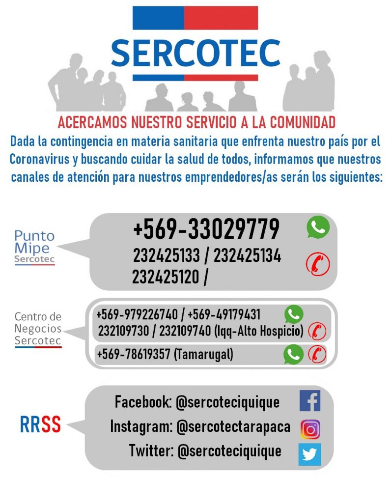 Para contactarse con el Centro de Negocios Sercotec Iquique puede hacerlo a los teléfonos: 232109730 – 232109740, para consultas sobre asesorías vía WhatsApp al +569 979226740 y para consultas sobre talleres vía WhatsApp al +569 49179431. En el caso del Centro de Negocios Sercotec Tamarugal puede llamar y consultar vía WhatsApp al +569 78619357.