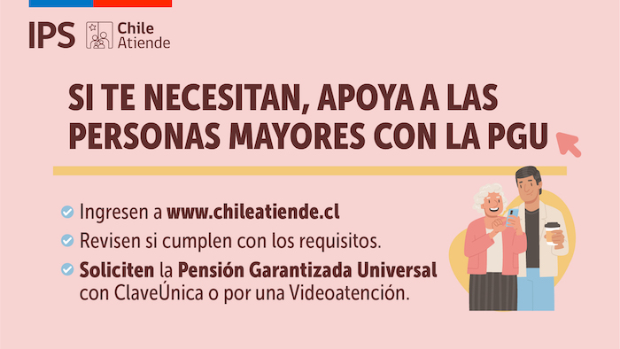 - El Instituto de Previsión Social, IPS, hace un llamado a los más jóvenes y familiares para que apoyen a las personas mayores que, cumpliendo los requisitos, necesitan más ayuda para averiguar sobre la Pensión Garantizada Universal (PGU). Para ello, pueden acceder al sitio www.chileatiende.cl y al servicio de videoatención del IPS.