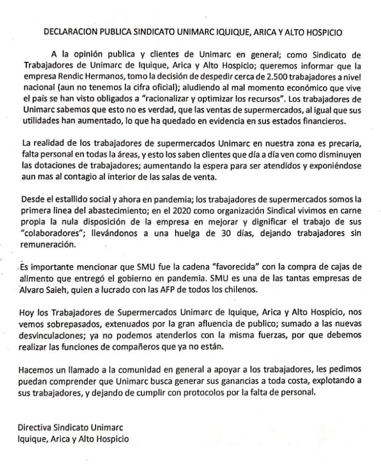 El Sindicato de Trabajadores de Unimarc de Iquique, Alto Hospicio y Arica, dieron cuenta a través de una declaración pública que la empresa que tiene supermercados a lo largo del país, despedirá a 2 mil 500 trabajadores. A continuación, la declaración: