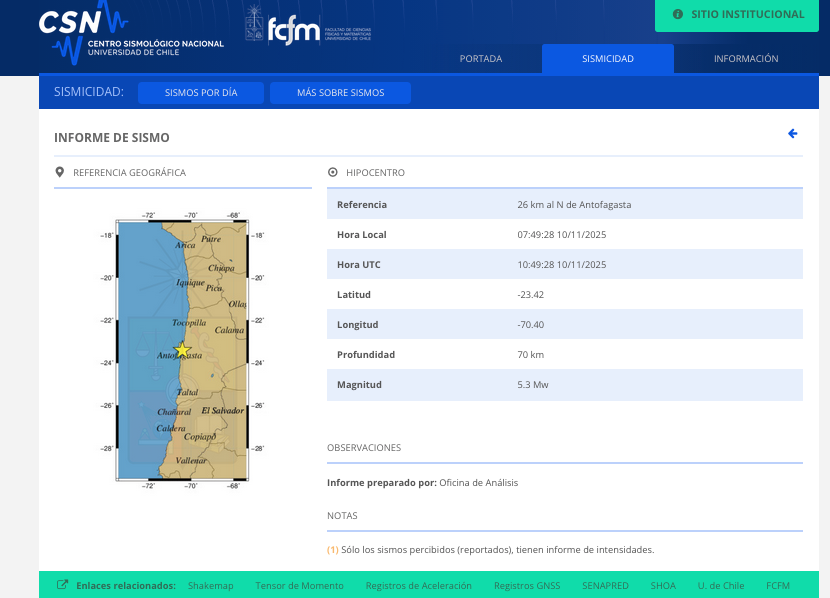 Según información preliminar del Centro Sismológico Nacional, la intensidad fue de 5.4 con un epicentro a 48 kilómetros al SO de Mejillones y con una profundidad de 70 kms.