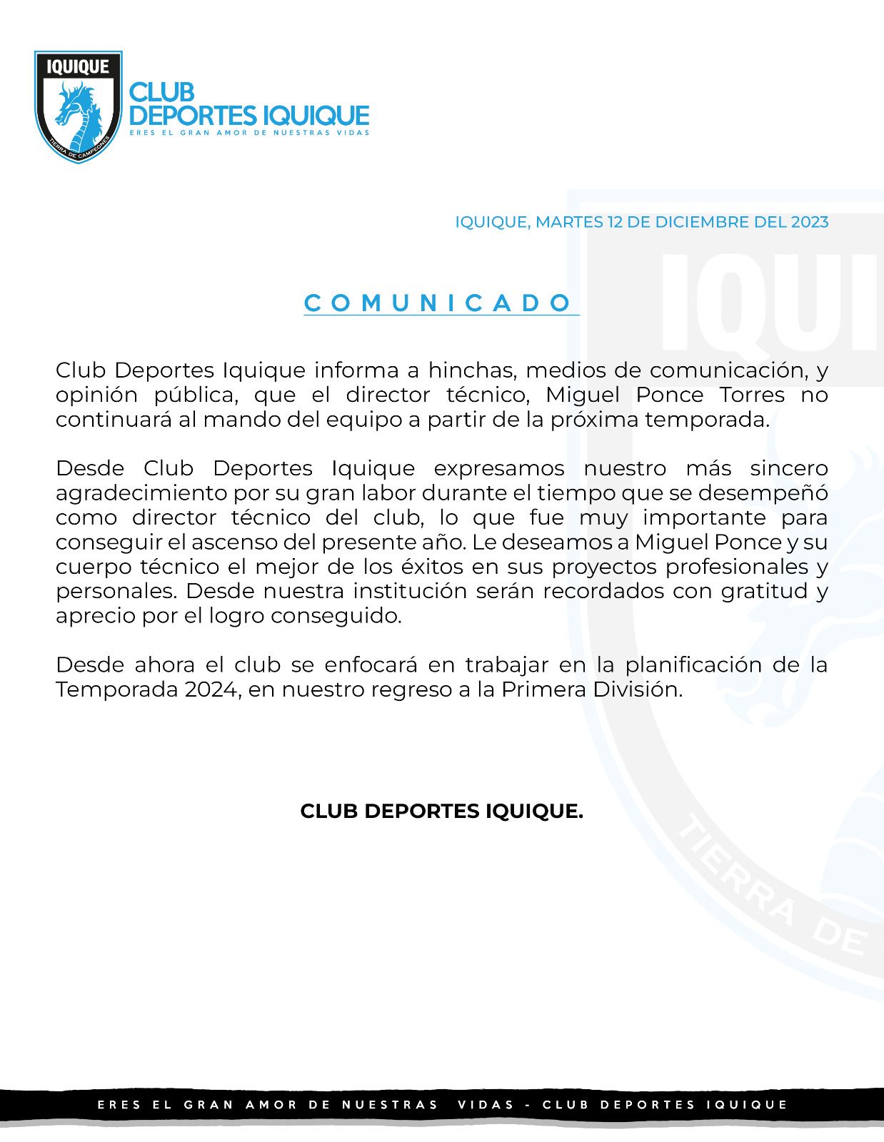 Este es el comunicado que el Club de Deportes Iquique difundió hoy a través de sus redes sociales: