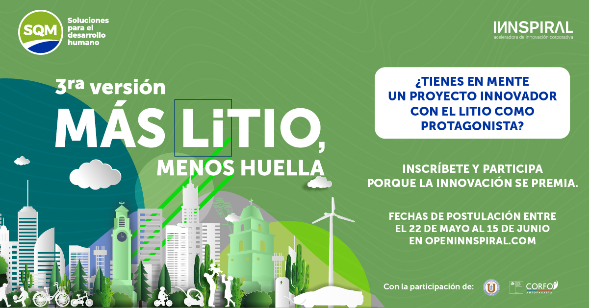 Promover la experimentación, pilotaje e implementación de nuevas soluciones relacionados a la transición de energías limpias, electromovilidad y cuidado del recurso hídrico en comunidades de las regiones de Antofagasta y Tarapacá, es el principal objetivo de la convocatoria “Más Litio, Menos Huella” impulsada por tercer año consecutivo por SQM en conjunto con la aceleradora de innovación INNSPIRAL.