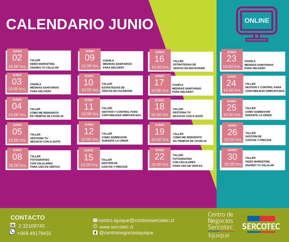 Con el objetivo de ayudar a los emprendedores de Iquique y Alto Hospicio, quienes se han visto afectados producto de la crisis sanitaria y además económica que afecta al país, donde muchos han debido adaptar sus actividades comerciales, el Centro de Negocios Sercotec Iquique, dictará durante este mes una serie de talleres online gratuitos destinados a orientar a todos quienes necesiten apoyo para reestructurarse, conocer nuevos canales de venta online, potenciar sus redes sociales y utilizar la opción del delivery como una nueva alternativa de venta.