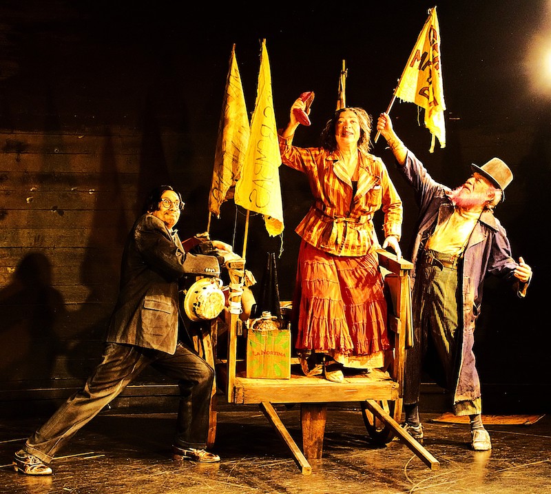 En esta creación, tres figuras —Chicho, Mateo y Virgen— empujan una carreta por un desierto que podría ser Atacama o cualquier territorio arrasado por la codicia. No son héroes ni mártires, sino restos de humanidad en tránsito. Llevan huesos, trastos y consignas que resuenan como relámpagos de humor desesperado: “¡Menos bombas, más empanadas!” o “¡Maten al odio, no al vecino!”. En esa carcajada deformada se instala la tragedia de nuestro tiempo.