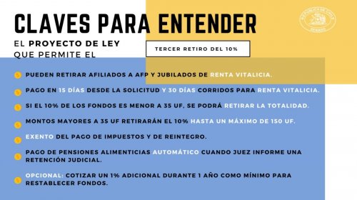 Así las cosas, con 30 votos a favor, 9 en contra y 1 abstención se ratificó la norma que señala que desde la publicación en el Diario Oficial de esta reforma y hasta los 365 días siguientes, los pensionados o sus beneficiarios por renta vitalicia podrán, por una sola vez y de forma voluntaria, adelantar el pago de sus rentas vitalicias hasta por un monto equivalente al 10% del valor correspondiente a la reserva técnica que mantenga el pensionado en la respectiva compañía de seguros para cubrir el pago de sus pensiones, con un tope máximo de 150 UF.