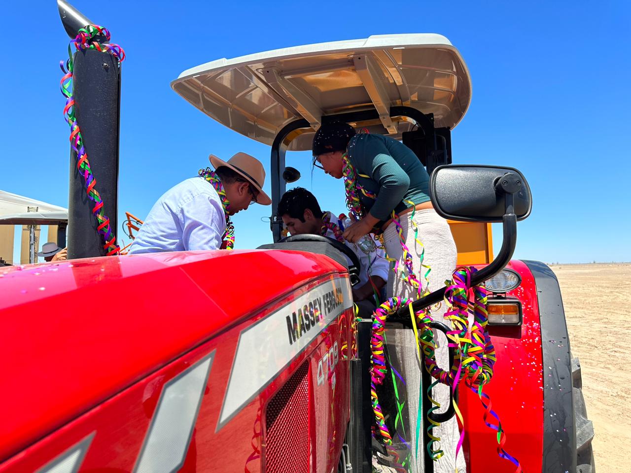 La entrega consideró 2 tractores de 95 HP, 2 rotovatores, 2 arados de discos, 2 colosos de arrastre y una fumigadora, maquinarias y equipamiento que permitirá optimizar, entre otras cosas, el proceso de arado de la tierra.