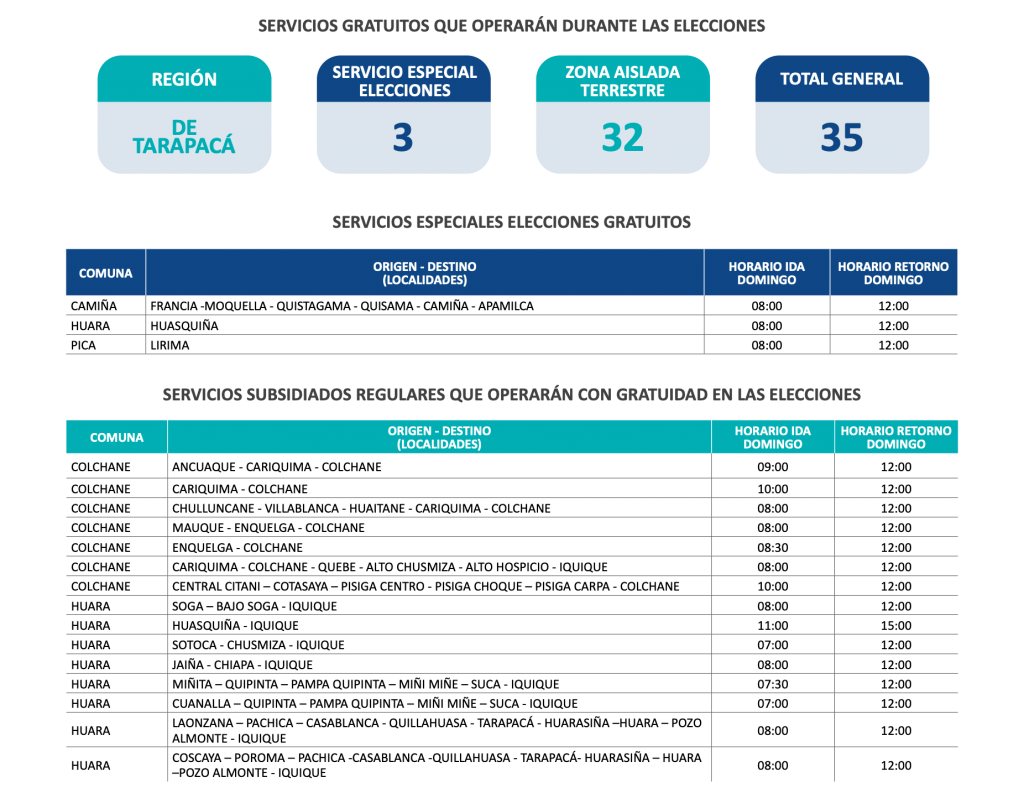 Ayer, el seremi de Transportes de Tarapacá, Carlos Navarrete, informó el funcionamiento del transporte público para este domingo 13 de junio, donde en 13 de las 16 regiones del país se llevará a cabo la segunda vuelta de las elecciones para gobernadores. “En la región de Tarapacá se mantendrá el mismo esquema de las elecciones pasadas, disponiendo para la comunidad 35 servicios de transporte gratuitos para quienes necesiten trasladarse hasta los distintos locales de votación”, indicó Navarrete.