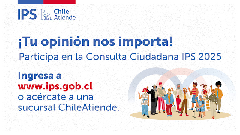 - Durante octubre está disponible la consulta que permitirá indagar el conocimiento de la ciudadanía sobre la red ChileAtiende del IPS y cómo se vincula con la gestión pública. La encuesta es breve y se puede responder en www.ips.gob.cl o visitando cualquiera de las 202 sucursales ChileAtiende, en todo el país.