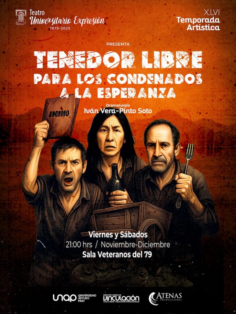 A fines de octubre, el Teatro Universitario Expresión de la Universidad Arturo Prat presentará“Tenedor libre para los condenados a la esperanza”, obra de mi autoría, en el marco de su 46ª temporada. No es solo un estreno: es una acción de reivindicación cultural, un recordatorio de que necesitamos el arte que despierta, incomoda y obliga a mirar lo que muchos prefieren ignorar. Como dijo José Saramago: “El arte existe porque la vida no basta”.