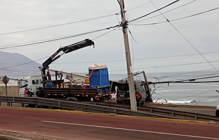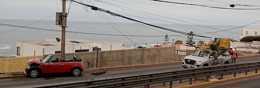Los vehículos que se trasladan a los diversos trabajos en el sector de Patache o quienes se dirigen al sur, tuvieron que desviarse de la Costanera, subiendo por avenida Padre Hurtado hasta Diagonal Bilbao o por la caletera pegada al conjunto habitacional de Quebrada Blanca, lo que provocó una serie de inconvenientes en calle Teresa Wilms Montt. Carabineros está en el lugar dirigiendo el tránsito debido a este accidente que registra un poste quebrado, la suspensión del suministro eléctrico y dos vehículos con cuantiosos daños, un Austin mini y un furgón de transporte de pasajeros.